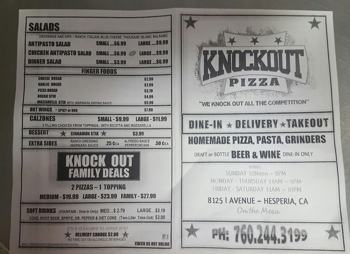 Welcome to Knock Out Pizza, your go-to destination for delicious, hand-crafted pizzas in Hesperia, CA. Situated at 8125 I Ave, this local gem boasts a menu filled with mouth-watering options that cater to every craving. Customers rave about the perfectly cooked dough and generous toppings, making each slice a satisfying experience.